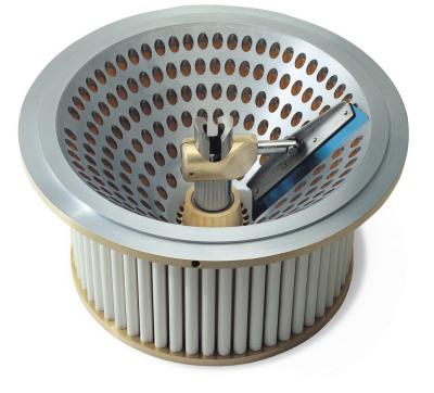 LA MÁSCARA DE CORTE Y VENTILACIÓN DE TRASLACIÓN. Construida en acero inoxidable electrosoldado está instalada sobre una columna que permite el movimiento vertical de subida y bajada. La columna está dotada de oportunas guías para su desplazamiento de traslación horizontal utilizado para liberar el espacio debajo del cabezal para permitir una más fácil limpieza de la zona o la utilización de otras máquinas de corte (Producción de moños o noodle). La máscara está oportunamente iluminada para permitir la visión de la superficie de corte y de la extrusión orificio-orificio mediante dos grandes aberturas. En la máscara está colocada una cinta transportadora realizada en poliuretano a norma FDA con movimiento continuo y reversible (patente Landucci). La cinta transportadora evita distorsiones de la pasta por efecto de la caída después del corte, la pasta se acompaña a la boca del trabatto.