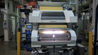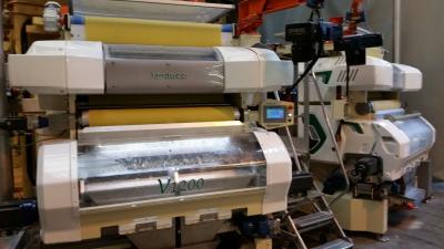 Режуще-гибочная машина для производства макаронных изделий Болонья "V 1 200": инновационный дизайн с вертикальной вставкой пластины теста. Эта функция обеспечивает очень короткие маршруты прохода теста между областью калибровки и областью резки с огромными преимуществами для цвета конечного продукта. Конвейерная лента регулируется инвертором для оптимизации скорости экструзии.